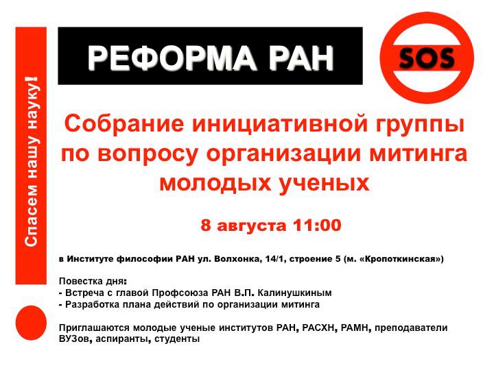 8 августа в Институте Философии РАН в 11:00 состоится собрание инициативной группы по вопросу организации митинга молодых ученых.